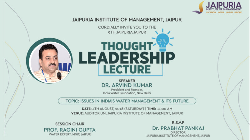 9th Thought Leadership Lecture at Jaipuria Jaipur will be delivered by Dr Arvind Kumar, President and Founder of India Water Foundation, New Delhi . Dr Arvind is a renowned water policy specialist.