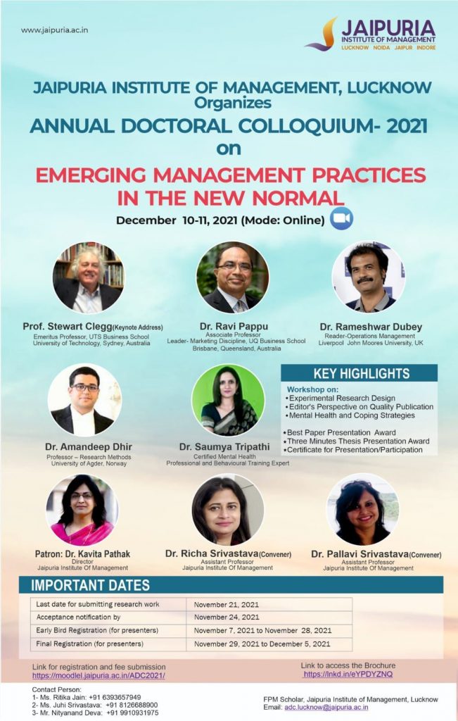 Jaipuria Institute of Management, Lucknow organized its first Doctoral Colloquium on December 9-10, 2021. The theme of the two-day Annual Doctoral Colloquium-2021 was “Emerging Management Practices in the New Normal”. The event attracted national and international participants and attendees. The keynote address by Prof. Stewart Clegg, Emeritus Professor, UTS Business School, University of Technology, Sydney was very insightful and thought-provoking. Prof. Clegg is a world-renowned Australian sociologist organization theorist, highest published and cited authors in the top-tier journals in the Organization Studies, and is acclaimed for his Theory of Power. He spoke on “The Corona Pandemic and its Implications: A New Normal?”