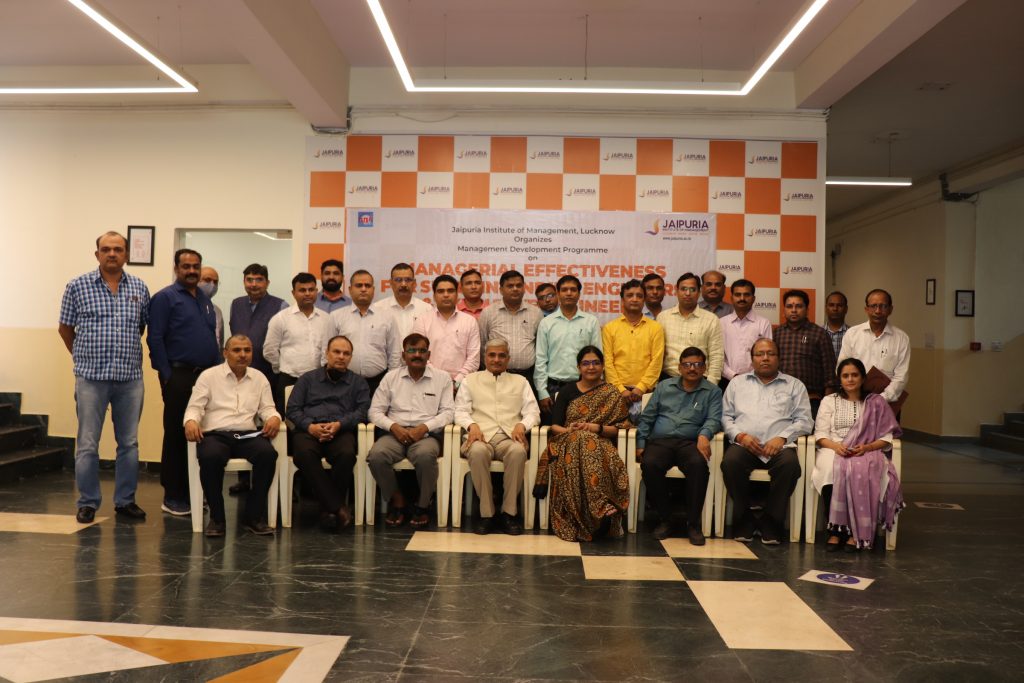 On October 21, 2021, Jaipuria Institute of Management Lucknow organized a Management Development Programme on “Managerial Effectiveness” for Superintending Engineers and Executive Engineers of Uttar Pradesh Power Transmission Corporation Limited (UPPTCL). There were sessions on Developing Positive Attitude and Behaviour, Leadership and Managerial Effectiveness, E-Office and Government E-Marketplace (GEM) Portal, and Positive Attitude for Managerial Excellence.